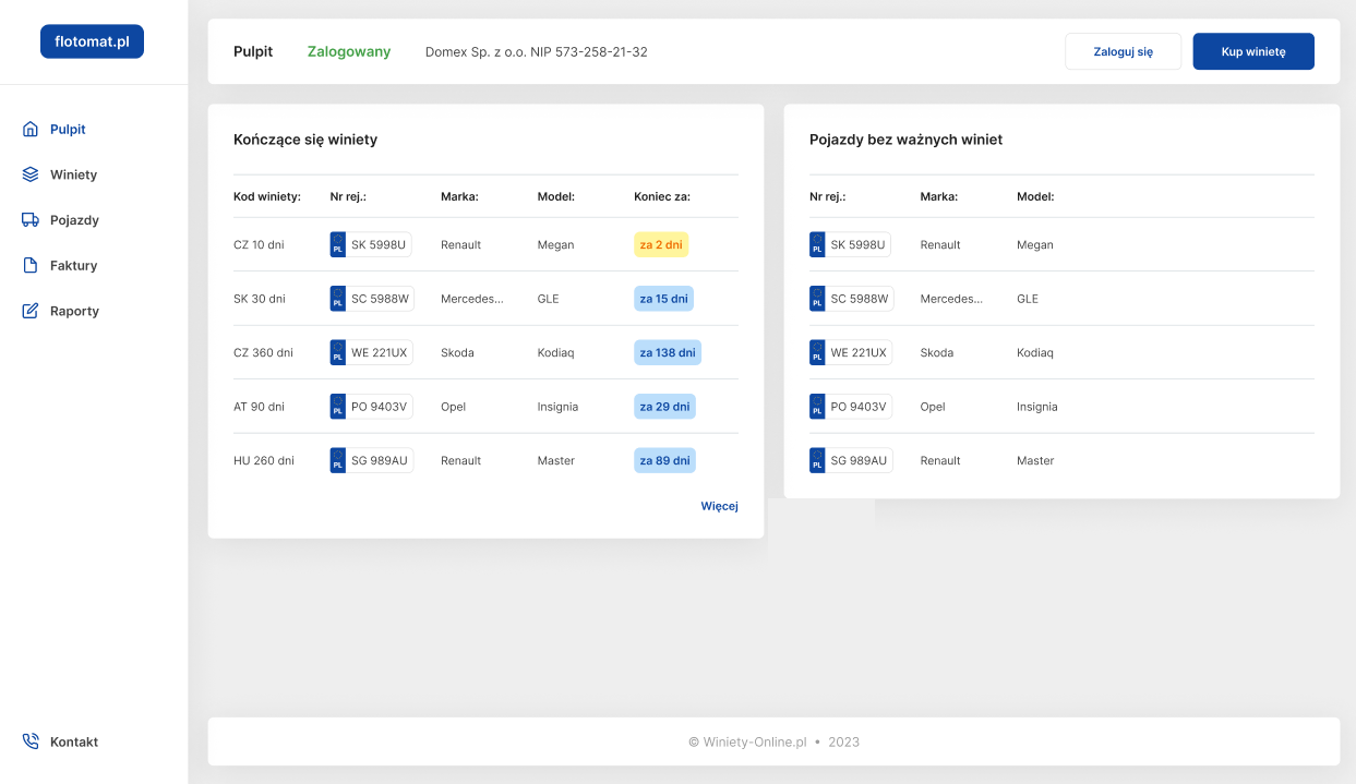 Korzystaj z pulpitu, zarządzaj swoją flotą, sprawdzaj jej status oraz wykupuj nowe winiety bezpośrednio z pulpitu na Flotomat.pl