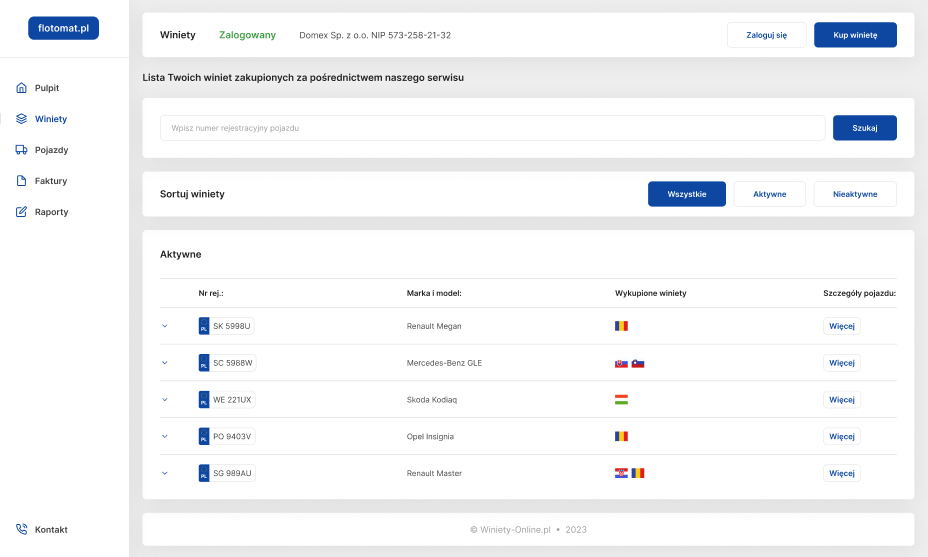 Ważne! Wszystkie winiety dla samochodów firmowych kupowane również poprzez serwis Winiety-Online.pl są automatycznie przyporządkowywane do pulpitu Państwa firmy na Flotomat.pl