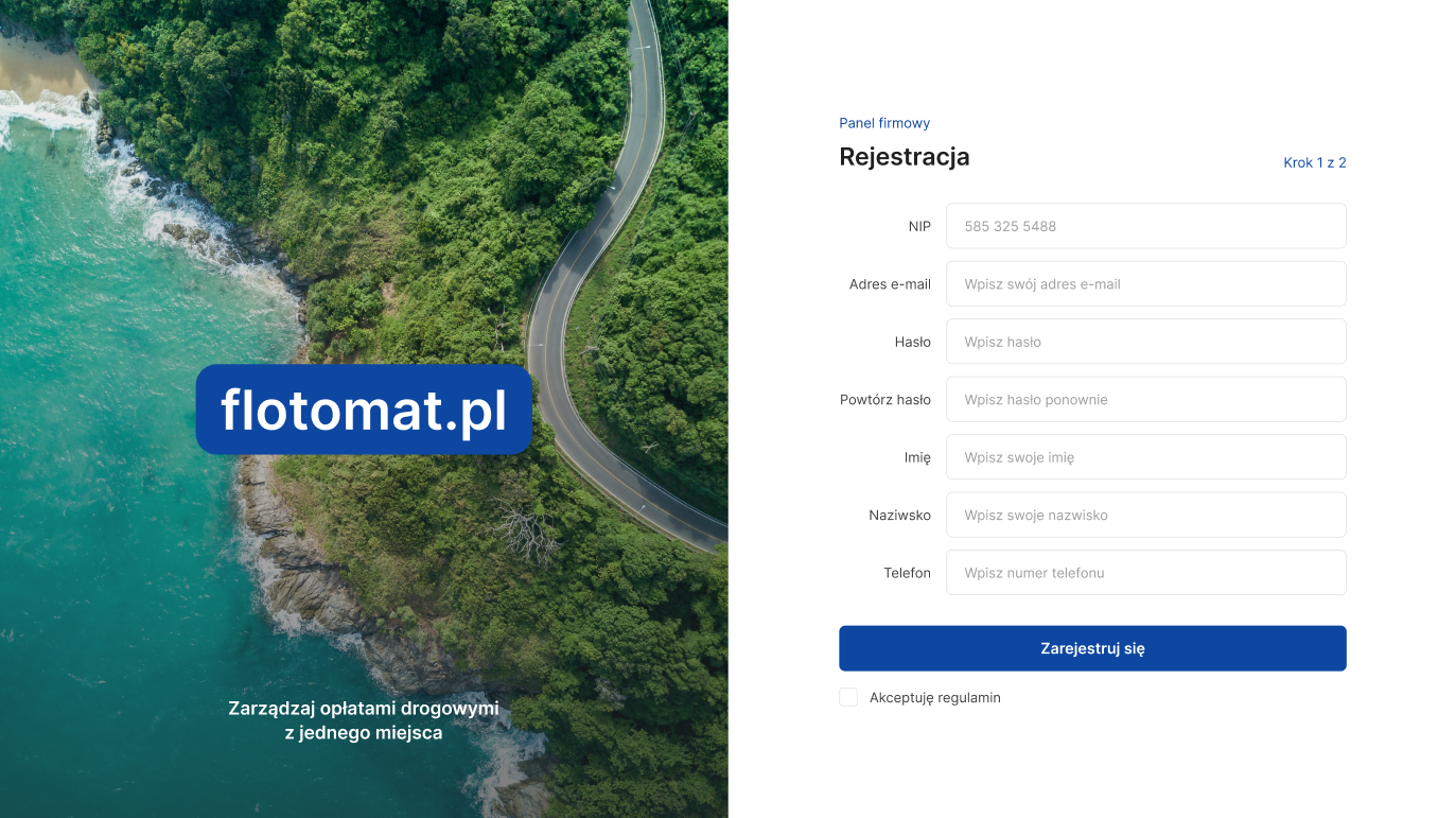 Aby zacząć korzystać z panelu dla firm, należy przejść jednorazową rejestrację wraz z weryfikacją firmy. Chcemy, aby Państwa dane były bezpieczne.